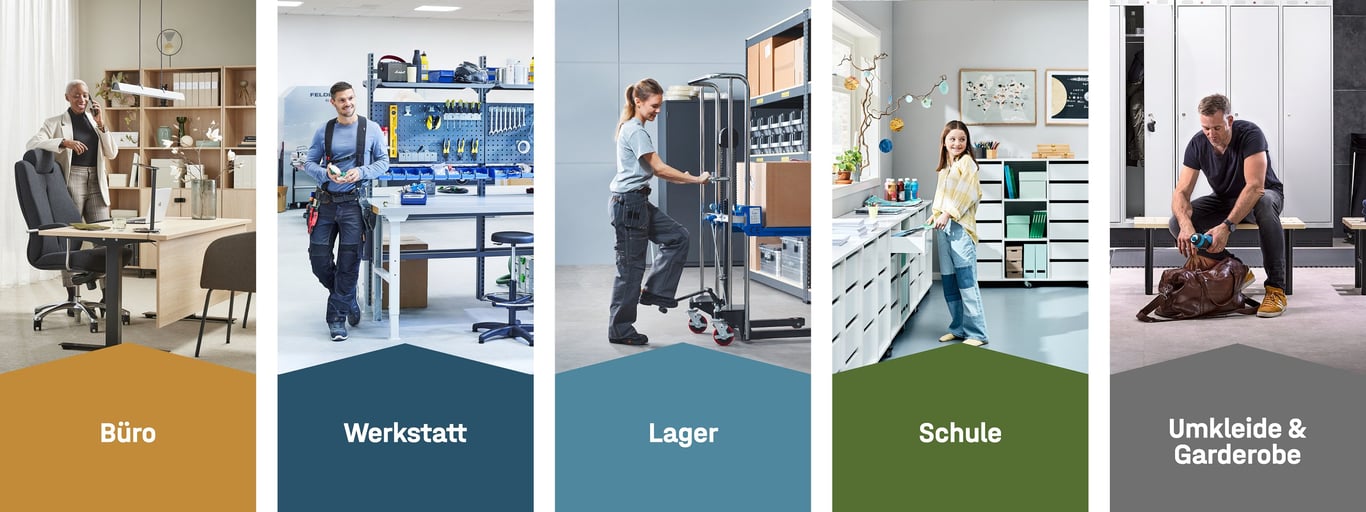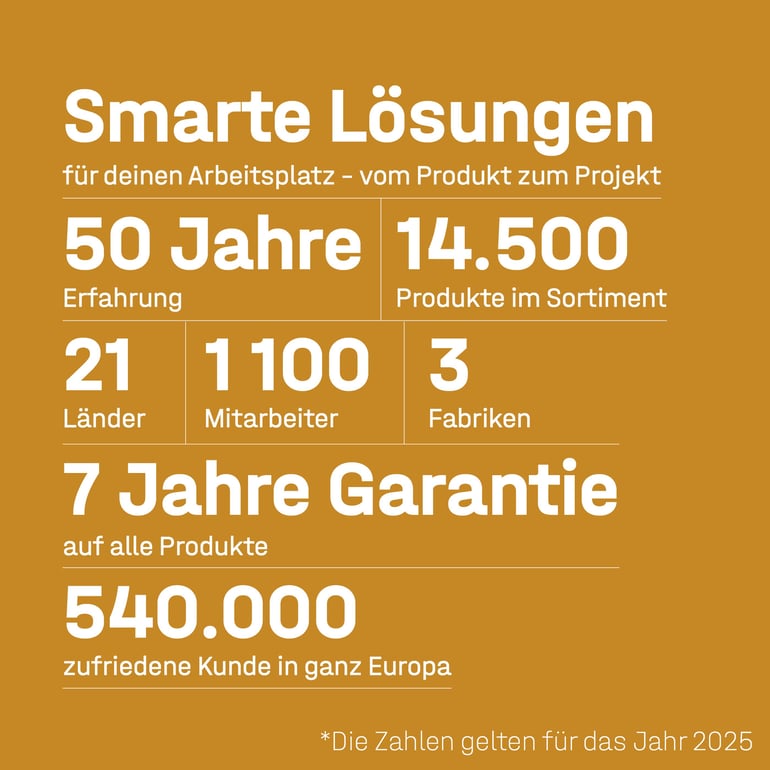 Das Sortiment besteht aus Möbeln, Ausstattung und Einrichtungslösungen, die den Arbeitsalltag angenehmer machen. Insgesamt gibt es fast 15.000 Produkte für Büro, Schulen, Lager, Industrie und Umkleideräume.