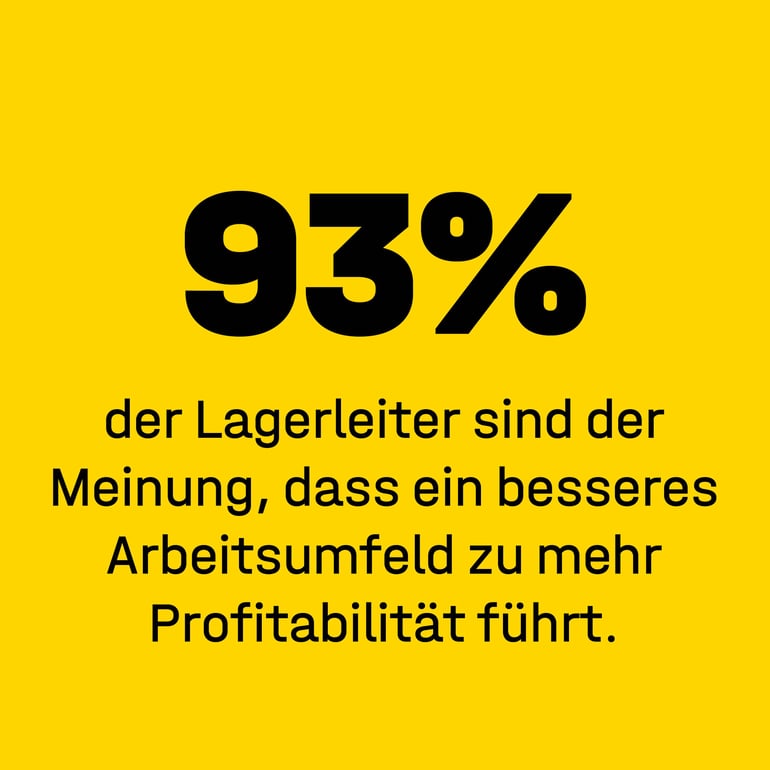 Sehen das die befragten ManagerInnen auch so? Nicht weniger als 93 % von ihnen stimmen dem zu und sehen einen engen Zusammenhang zwischen Profitabilität und der physischen Arbeitsumgebung. Mehr als die Hälfte der Lagerleiter sehen das Arbeitsumfeld als extrem wichtig.