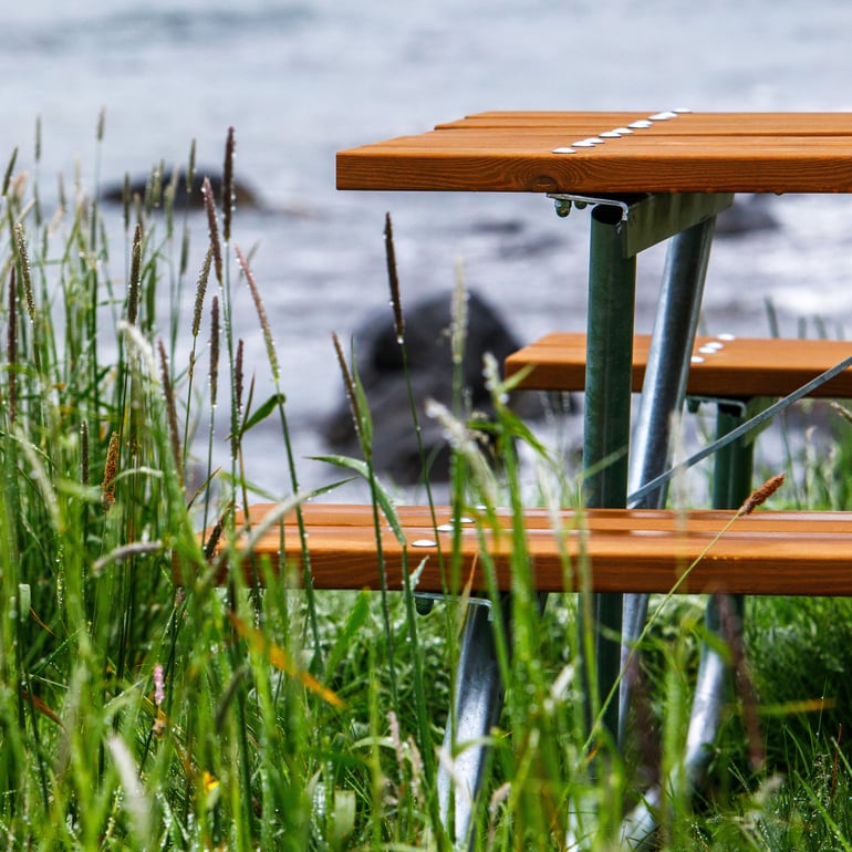 Was ist notwending, damit eine Sitzbank rauem Wetter standhält? Aus unserer Sicht geht es um eine robuste Konstruktion und darum, dass die Materialien sorgfältig ausgewählt werden. Wir wählen zum Beispiel feuerverzinkten Stahl oder Aluminium für unsere Metallrahmen, während die Holzdetails aus haltbaren Dielen aus schwedischer Kiefer bestehen, die entweder gebeizt oder lasiert sind. Das Ergebnis ist ein hochwertiges Möbelstück mit einer Oberfläche, die sowohl für das Auge angenehm als auch äußerst witterungsbeständig ist.