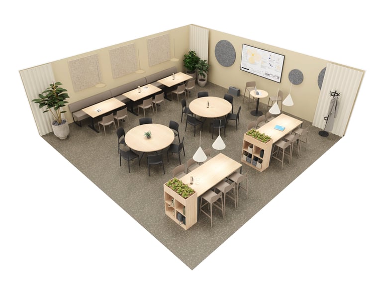 Stapelbare Stühle, Tische in unterschiedlichen Höhen und großzügige, offene Flächen machen es leicht, den Raum spontan neu zu gestalten. Ob für große Meetings, lockere Gespräche oder entspannte Mittagspausen – hier findet alles Platz, ohne dass auf Komfort verzichtet werden muss. Runde Tische schaffen eine einladende Atmosphäre und fördern das Miteinander. Die QBUS-Aufbewahrungsmöbel bieten praktische Lösungen, um Technik sicher zu verstauen oder Taschen während der Pause abzulegen. Warme Holzdetails und sanfte Farbtöne verleihen dem Raum eine wohnliche Note – für ein angenehmes Umfeld, das von morgens bis abends funktioniert.