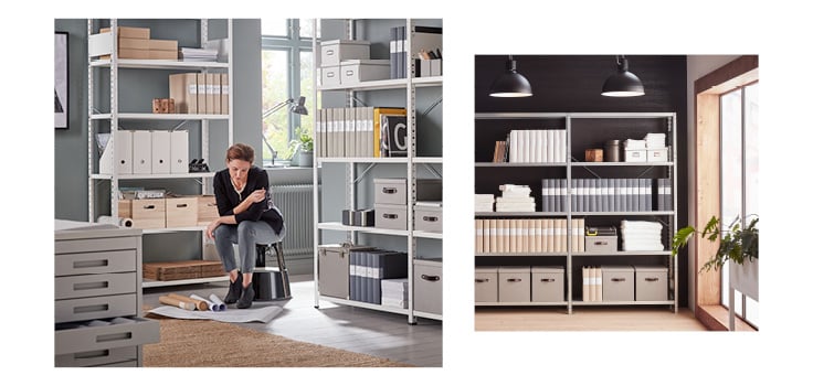 Light und Total sind flexible und langlebige Regale aus unserem Sortiment, die sich ideal zur Aufbewahrung von etwas leichteren Waren wie Büchern, Ordnern und Aktenboxen eignen. Die Regale sind einfach zu montieren und das stilvolle Design ermöglicht es, sie im Büro zusammen mit schönen Innendetails, Aufbewahrungsboxen und einigen grünen Pflanzen zu verwenden, um ein modernes und industrielles Gefühl zu vermitteln. Das Gewicht, das jedes Regal tragen kann, beträgt 150 kg.